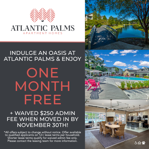 Preview life at Atlantic Palms as you scroll through the impressive images below. After taking a glance at our inviting floor plans and amenities, feel free to drop by for an in-person tour of our apartments in Charleston, SC.